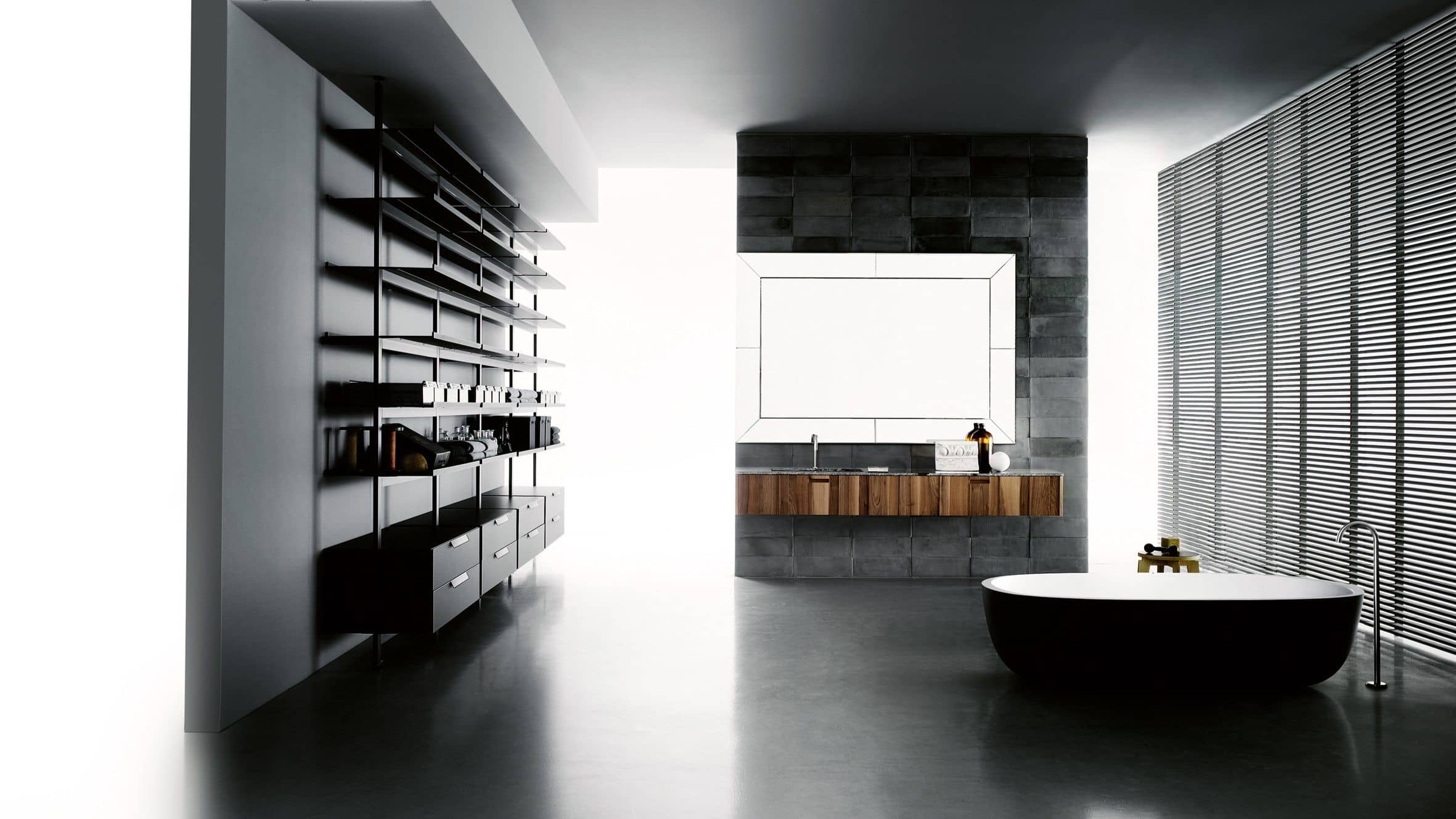 Piero Lissoni's Programma Standard is a modular system of bathroom units consisting of hinged doors, flap doors, drawers, and single pull-out doors in different finishes. Pull-out Legrabox drawers in varnished matt black metal and internal shelves in black melamine.