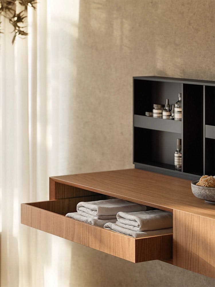 The Upper modular system integrates three groups of elements: Upper Units wall hung washbasin or storage base units; Upper Boiserie wall panelling system; and Upper, a modular system of open-faced storage units. Design Piero Lissoni + CRS Boffi.