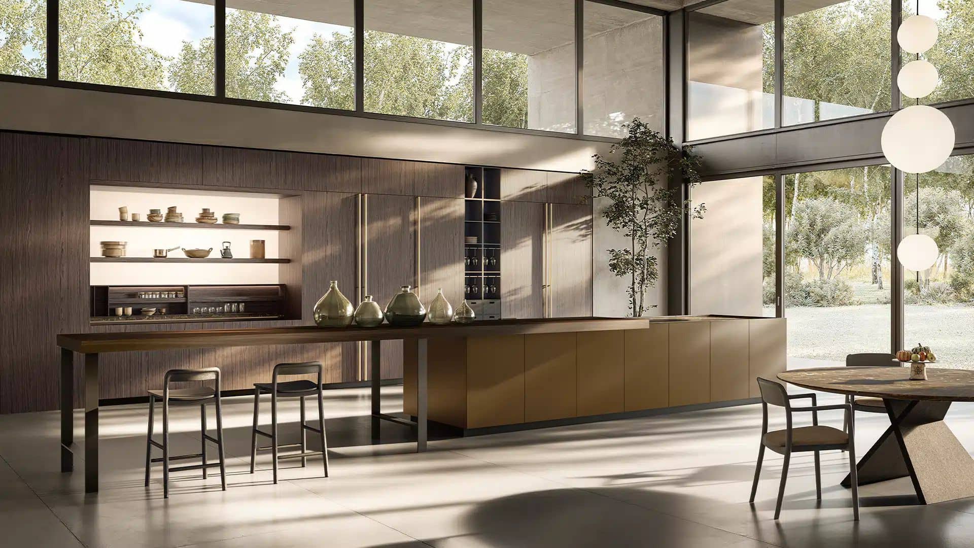 The K21 kitchen model originates from the innovative concept of the designer Norbert Wangen whose K series transformed the concept of the compact kitchen. THE K21 iffers an extremely defined and monolithic appearance, highlighted by the handleless units and worktop with basin effect