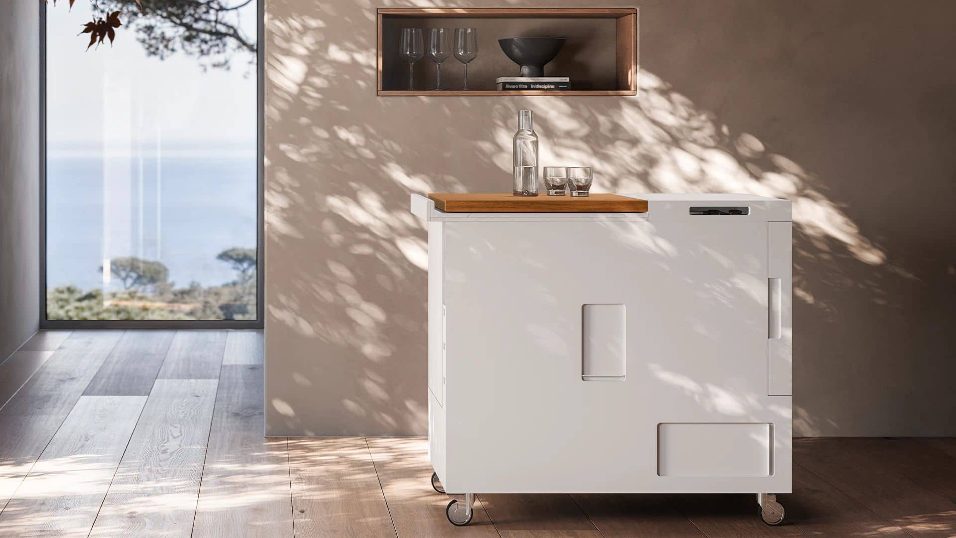 Joe Colombo's Minikitchen is a complete kitchen cube on wheels. This compact project comprises everything needed from a kitchen, even if in miniature: refrigerator, cooking range, containers, drawers for pots and dishes for six people, cutting boards, and sockets for small electric appliances.