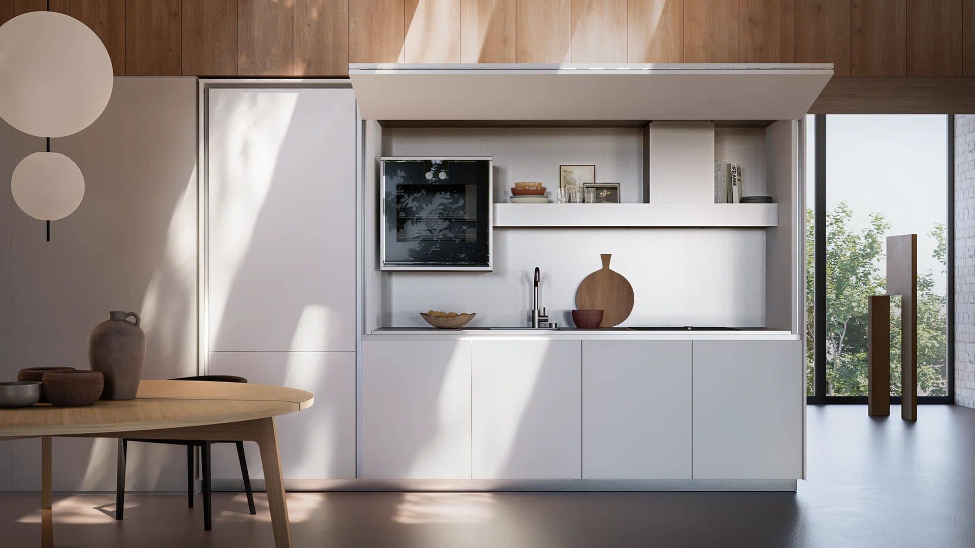 The ON-OFF ST modular kitchen is characterised by a self-standing structure equipped with a folding door, which opens upwards electronically, revealing the worktop area inside. Once closed, it completely conceals the working area, transforming the kitchen into a monolithic furniture piece.
