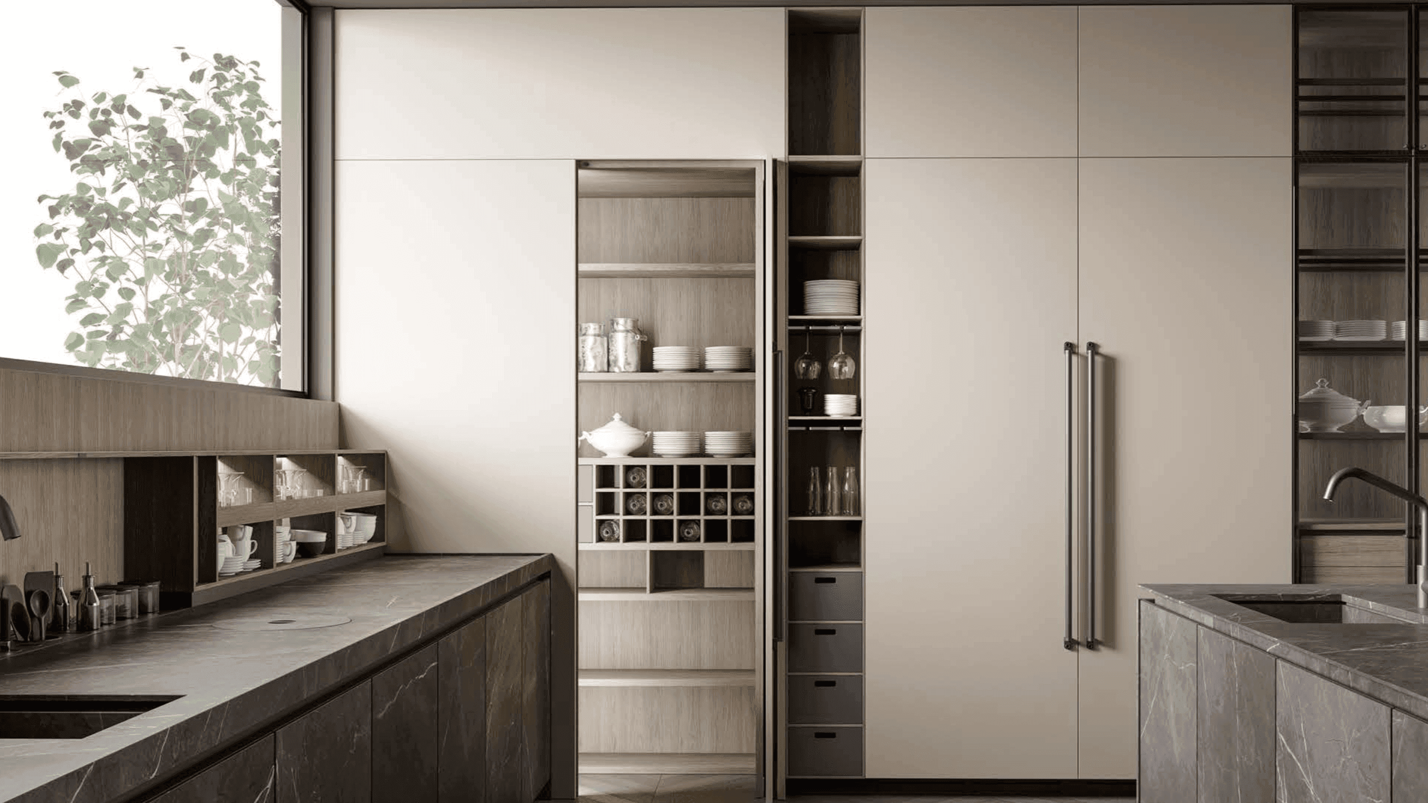 Hide is a tall unit system, consisting of single side structural panel and doors that can be hinged, side-recessing or folding side-recessing.