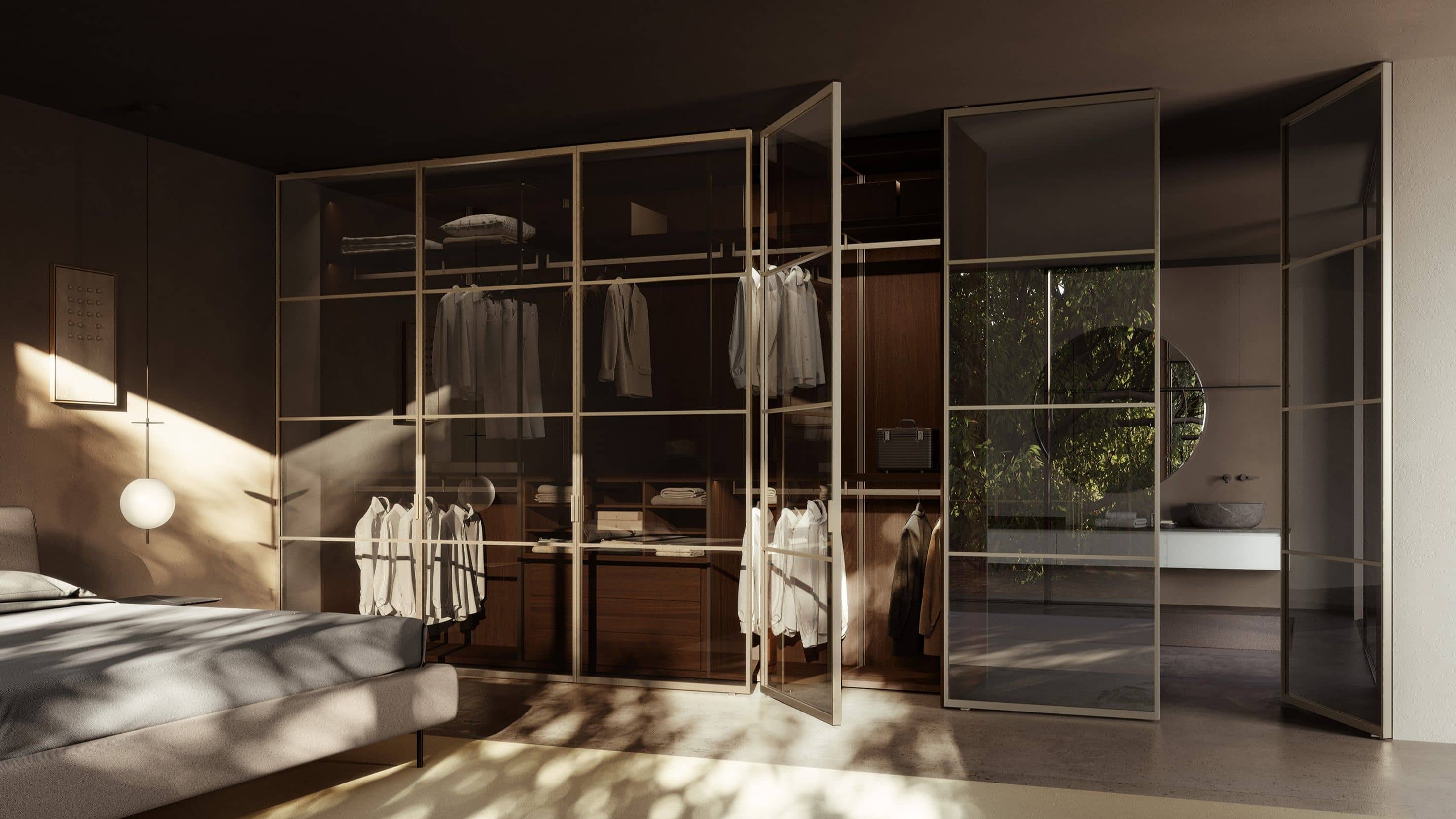 Piero Lissoni's Antibes is composed of wardrobes with single side panels in various finishes and materials that are distinguished by its coherent and minimalist look. Various compositions can be achieved by matching the Antibes wardrobe with doors with Antibes walk-in closet without doors.